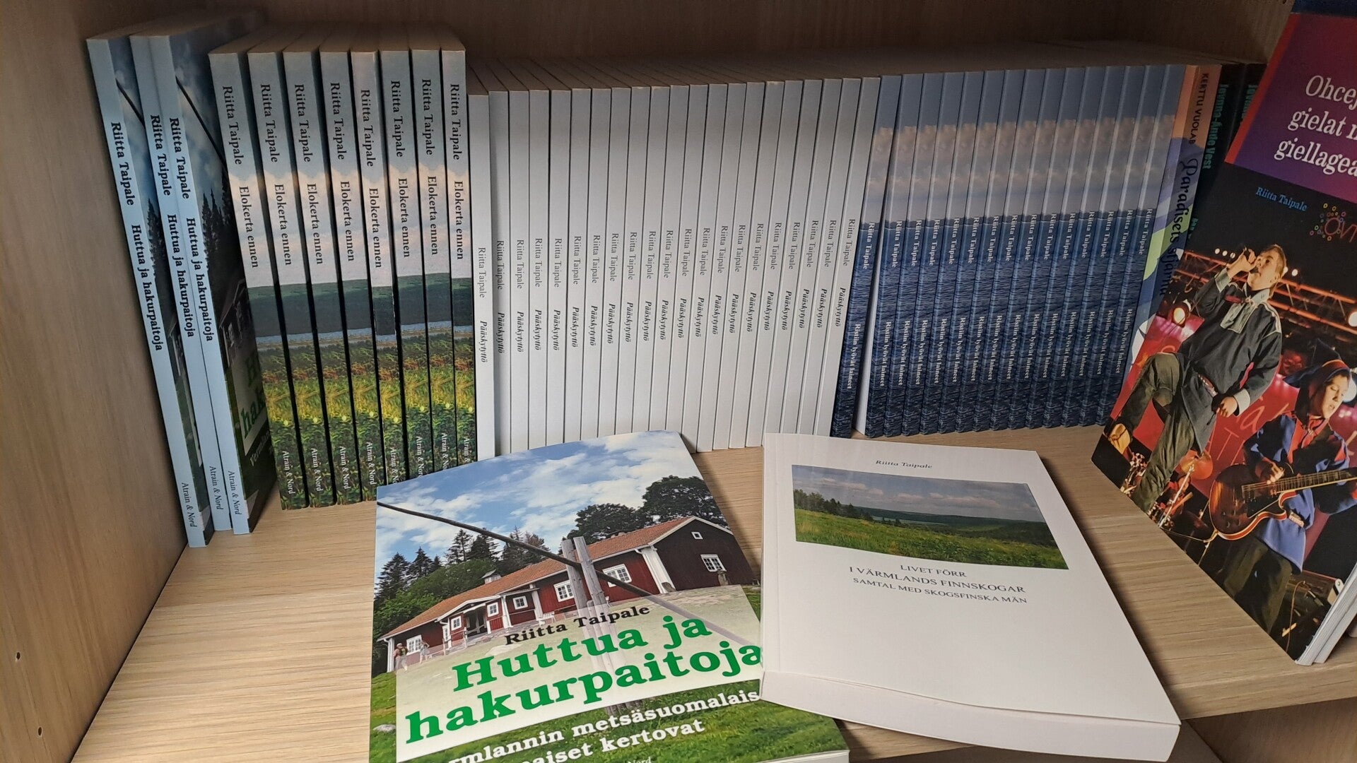 Författaren Riitta Taipale presenterar sina böcker via Facebook och säljer dem genom Kirjasieppo.eu . Bokurvalet består av forskningsbaserade faktaböcker om tvåspråkighet, språkbyte, folktradition och folklore och minoriteters historia; därtill också självbiografiska romaner från barndomen till vuxenlivet. Språken är svenska eller finska. Kirjasieppo kommer att utvidga urvalet till olika genrer.